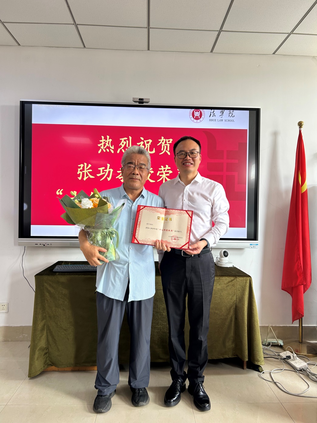 本网讯 2025年9月11日下午,在知行楼403会议室,校领导张忠民副校长慰问法学院十佳师德标兵张功教授,法学院领导班子和系部主任参加颁奖仪式。