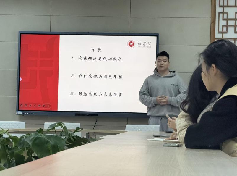 法学院团委实践部部长艾宸宇率先分享,从实践概况与成果、组织实施与特色、经验总结与展望三方面,全面介绍了法学院暑期社会实践情况,重点剖析了实践中的挑战与解决办法,为在场同学提供了实用参考。
