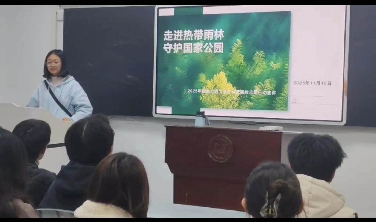 本网讯(通讯员:严谨琳)为响应生态文明建设号召,提升青年生态保护意识,法学院“绿肺卫士”宣讲团开展“走进热带雨林,守护国家公园”主题宣讲,走进工商、会计、新媒体等多个班级,推动绿色理念落地。