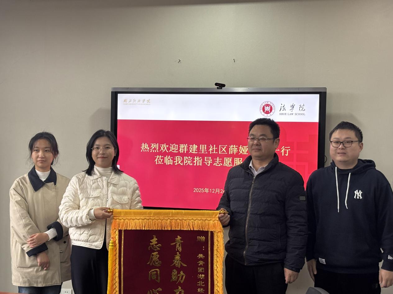 交流中,杨专详细介绍了学院志愿服务队建设、社区服务项目开展及志愿活动成效等情况,重点阐述了师生在法治宣传、社区治理等领域的志愿服务实践。薛娅对我院志愿服务工作的系统性、专业性给予高度评价,肯定了师生志愿者为社区发展作出的积极贡献,并代表社区向学院赠送锦旗,以表感谢。