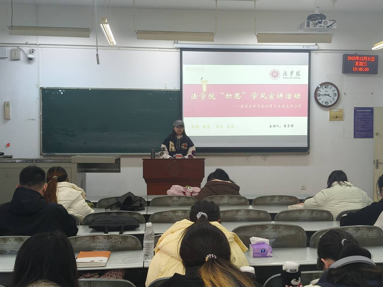 本网讯(通讯员:苟予希)为深入推进法学院“积思”学风建设,发挥优秀学子示范领航作用,帮助班级同学找准法学学习方向、汲取奋进力量,法学2441班举办本次学风宣讲活动,国家奖学金获得者苟予希同学受邀开展专属经验分享,班级全体同学参会聆听。