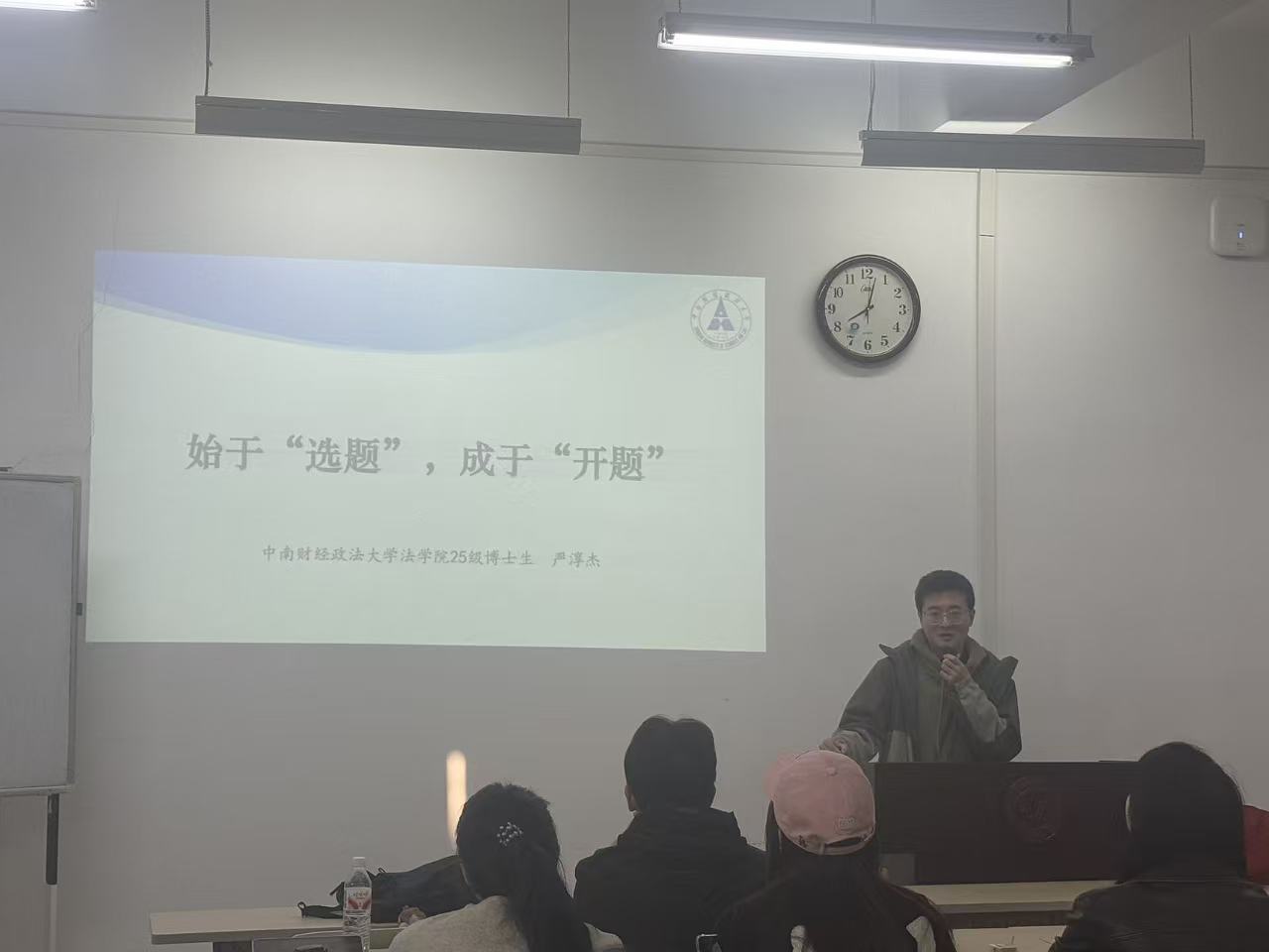 在方法论层面,严淳杰博士研究生详细剖析了选题的多维度衡量标准,包括问题意识是否突出、文献综述是否扎实、研究方法是否适配等。他特别提出,可借助解释论与比较法两大路径展开研究,例如通过法律解释的精细化分析或跨法域制度对比,挖掘选题的创新点与理论深度。此外,他结合期刊范文案例,拆解了开题报告的撰写逻辑、研究框架的设计技巧及论证过程的严谨性要求,为在场学子提供了可复制的学术写作模板。